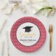 Cette plaque de papier de graduation (jetable) présente une illustration d'un casquette de graduation (mortier) et un texte personnalisable pour : Classe de, Nom des diplômés, Nom de l'école. Cette plaque de papier est accentuée d'un motif tourbillon blanc sur un arrière - plan rouge. Le mot "diplômé" est jaune.