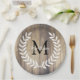 Bois de grange rustique et brun brun pâle à l'allure de planches arrière - plan avec silhouette de lauriers blancs encadrant votre choix de lettre monogramme en noir et nom de famille complet en écriture blanche. Ces assiettes sont parfaites pour les mariage ! Regardez les serviettes en papier correspondantes !
