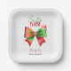 Red and green bow, Santa hat and snowflakes Christmas Santa Baby shower paper plate. This festive Christmas baby shower design is adorned with a prominent, impressive red and green bow covered with snow and with a snowflake at its center and a Santa hat. The phrase "Santa Baby" is written in script and decorative typography.