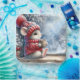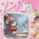 Une souris douillette en chandail rouge et un casquette assis par une fenêtre gelée tenant une tasse de cacao chaud tout en admirant un paysage enneigé avec pins et flocons de neige