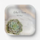 Personnalisez l'élégant Green Succulent sur les Plaques de papier Mariage blanc avec les noms de la mariée et du marié et date à utiliser à votre thème naturel douche nuptiale ou réception mariage. Ces assiettes jetables personnalisées de classe présentent une numériquement photo florale peinte d'un plante succulent vert avec un voile de mariée blanc et un arrière - plan satiné blanc.
