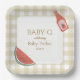 Tan gingham paper plate for gender neutral baby-q themed baby shower.