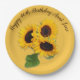 Plaques de papier d'anniversaire personnalisées avec du texte courbe le long du bord. Trois grands tournesols jaunes aux centres marrons et aux feuilles verts ornent le centre des assiettes jaune-or. Dites joyeux anniversaire avec l'âge et le nom, ou choisissez votre propre libellé.
