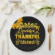 Grateful, Thankful, Bienheureux typographie en jaune de tournesol sur le noir avec un tournesol dans le coin.