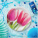 Plaques en papier avec une belle photo de printemps avec 2 tulipes roses et feuilles vert vif.