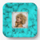 Un bel arrière - plan bleu turquoise est rempli de veines noires donnant l'illusion d'une pierre de marbre. Une incrustation photo apparaît au milieu encadrée par une bordure bleu perle faux brillant avec un faux bord doré. Changez la photo et utilisez le design pour un baby shower bleu et or ou fête d'anniversaire. Ils sont parfaits pour un thème occidental, du sud du Texas ou de l'ouest sauvage aussi.