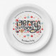 Joyeux Noël dans une police amusante est entouré de jolis articles de vacances sur ces assiettes de papier fantaisie. CORRESPONDANCE d'objets dans notre collection.