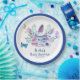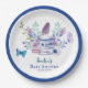 Un bébé est en train de brasser des plaques de papier de baby shower de fête du thé.Ce baby shower neutre pour les hommes et les femmes propose des tasses avec des fleurs violettes, bleues et roses et des papillons avec un macaron.Un thème de fête du thé baby shower rustique neutre pour les femmes.