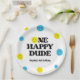 Plaques de papier amusantes et lumineuses 1er anniversaire avec des icônes de visage jaunes et bleues souriantes. "Un mec heureux" est dans une police super et rétro. Si vous souhaitez modifier ce texte, veuillez me contacter et je ferai des mises à jour sans frais supplémentaires.
