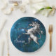 Belle illustration vintage de style héraldique unicorne sur ciel céleste arrière - plan. Personnaliser avec nom ou autre texte en caractères de script blanc.