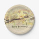 Belle et abstraite tache de couleur et tourbillons de fumée avec d'élégantes orchidées de couleur violette. Combinaison de couleurs artistiques dans des couleurs beige, jaune, vert, marron et vanille et un script de calligraphie Joyeux anniversaire. Personnalisez en changeant le texte ou cliquez sur personnaliser pour ajouter votre propre touche.