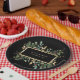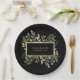 Ces étonnantes plaques en papier mariage de Noël ou de fête présentent de la verdure de vacances et des feuilles avec des feuilles en faux or et des baies rouges sèches, et un cadre en or central sur un arrière - plan noir moderne.
