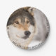 Fête d'anniversaire animalière, animalière, sauvage, bûcheron. Photo d'une tête de loup. Un loup à l'air amical avec un sourire sur le visage. C'est l'hiver avec un arrière - plan blanc enneigé. Une assiette pour la fête du 13e anniversaire d'un garçon ado. Avec le texte : Joyeux anniversaire (x2) Modèle pour le nom de l'enfant, lettres noires. Texte courbe.