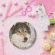 Fête d'anniversaire animalière, animalière, sauvage, bûcheron. Photo d'une tête de loup. Un loup à l'air amical avec un sourire sur le visage. C'est l'hiver avec un arrière - plan blanc enneigé. Une assiette pour la fête du 5e anniversaire d'un garçon. Avec le texte : Joyeux anniversaire (x2) Modèle pour le nom de l'enfant, lettres noires. Texte courbe.