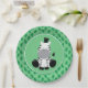 Ce plat de partie comporte un arrière - plan vert avec un motif de répétition de feuille de jungle. Un zèbre noir et blanc de clipart mignon de bébé se repose au centre du plat.