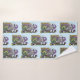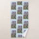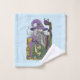 Un sorcier tout en violet tenant un bâton qui a une boule de cristal violet. Un petit dragon vert, un noeud celtique, une bougie et une bordure d'automne feuilles le tout dans un décor bleu clair