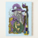Un sorcier tout en violet tenant un bâton qui a une boule de cristal violet. Un petit dragon vert, un noeud celtique, une bougie et une bordure d'automne feuilles le tout dans un décor bleu clair