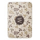 Illustrative surface pattern design of assorted leaf silhouettes in browns and gold on a cream colour background with initial centre to personalize.