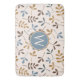 Illustrative surface pattern design of assorted leaf silhouettes in blues, brown and gold on a cream colour background with initial centre to personalize.