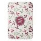 Illustrative surface pattern design of assorted leaf silhouettes in reds and greens on a cream colour background with initial centre to personalize.