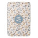 Illustrative surface pattern design of assorted leaf silhouettes in blues, brown and gold on a cream colour background with initial centre to personalize.