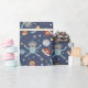 Space-themed wrapping paper with a pattern of sloth astronauts floating in space among spaceships, alien spacecrafts, planets, shooting stars, and moons.