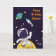 A birthday greeting card with a dark blue background with yellow stars scattered around. Layered over top is an illustration of a spaceman wearing a white astronaut suit floating above the moon. Waving hello as he explores space. Off in the distance is a planet with rings and a rocket ship flying off into space. Personalized message on the inside.