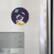 A magnet with a dark blue background with yellow stars scattered around. Layered over top is an illustration of a spaceman wearing a white astronaut suit floating above the moon. Off in the distance is a planet with rings and a rocket ship flying off into the sky looking for new worlds to explore.