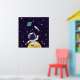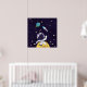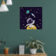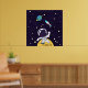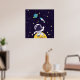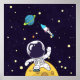A poster with a dark blue background with yellow stars scattered around. Layered over top is an illustration of a spaceman wearing a white astronaut suit floating above the moon. Off in the distance is a planet with rings and a rocket ship flying off into the sky looking for new worlds to explore.