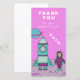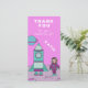 A personalizable thank you card for kids. A girl astronaut on the Moon with her rocket ship. Great for a girl because of the pink and turquoise colour scheme.
