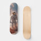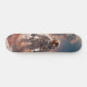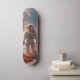 The skateboard has a thematic design related to an astronaut and an alien environment. In other words, the skateboard features illustrations representing an astronaut and an alien landscape on its surface. This theme suggests the fusion of space and alien elements in skateboarding design, which provides a unique and futuristic aspect to this recreational means of transport.