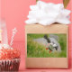 Rectangular photo sticker of an atlantic puffin bird flying with spread wings before landing at the island of Runde at the Atlantic coast of Norway.