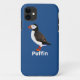 A digital painting of an Atlantic Puffin. Text reading "Puffin" also appears. The Atlantic Puffin (Fratercula arctica) feeds primarily by diving in the water. They breed in large colonies on coastal cliffs or offshore islands in the North Atlantic. They shed the colourful outer parts of their bills after the breeding season, leaving a smaller and duller beak. Their short wings are adapted for swimming with a flying technique under water. In the air, they beat their wings rapidly (up to 400 times per minute) in swift flight, often flying low over the ocean's surface.
