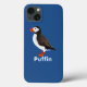 A digital painting of an Atlantic Puffin. Text reading "Puffin" also appears. The Atlantic Puffin (Fratercula arctica) feeds primarily by diving in the water. They breed in large colonies on coastal cliffs or offshore islands in the North Atlantic. They shed the colourful outer parts of their bills after the breeding season, leaving a smaller and duller beak. Their short wings are adapted for swimming with a flying technique under water. In the air, they beat their wings rapidly (up to 400 times per minute) in swift flight, often flying low over the ocean's surface.