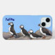 Puffins at rest on the rocks. Customizable text reading "Puffins" also appears. The Atlantic Puffin (Fratercula arctica) feeds primarily by diving in the water. They breed in large colonies on coastal cliffs or offshore islands in the North Atlantic. Puffins shed the colourful outer parts of their bills after the breeding season, leaving a smaller and duller beak. Their short wings are adapted for swimming with a flying technique under water. In the air, they beat their wings rapidly (up to 400 times per minute) in swift flight, often flying low over the ocean's surface.
