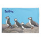 Puffins at rest on the rocks. Customizable text reading "Puffins" also appears. The Atlantic Puffin (Fratercula arctica) feeds primarily by diving in the water. They breed in large colonies on coastal cliffs or offshore islands in the North Atlantic. Puffins shed the colourful outer parts of their bills after the breeding season, leaving a smaller and duller beak. Their short wings are adapted for swimming with a flying technique under water. In the air, they beat their wings rapidly (up to 400 times per minute) in swift flight, often flying low over the ocean's surface.