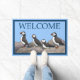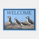 Puffins at rest on the rocks along with text reading, "WELCOME."