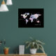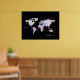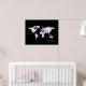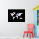 A graphic and water-coloured worldmap in soft pink colours, with the name of the continents and oceans, on black background