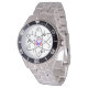Has heft and feel of expensive stainless steel quartz watches. Good band with safety catch. I removed links, which is easy because engraved arrows show direction to push the linking pins. As always by this seller, the image (a railroad logo) is a perfect reproduction of my emailed image, and is precisely spaced and aligned.