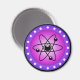 Science themed image. A circular shaped image with the symbol of the atom inside. A pink background contrasts with the black symbol. A purple border with white stars circles around the illustration. A cool image for geeks and science buffs.