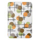 A retro atomic era inspired pattern with brown, orange, grey and chartreuse molecule circles, along with mid century modern styled bold lines.