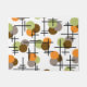 A retro atomic era inspired pattern with brown, orange, grey and chartreuse molecule circles, along with mid century modern styled bold lines.