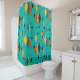 This shower curtain has a mid-century modern atomic design of diamonds, and starbursts on a field of turquoise.