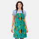 This apron has a mid-century modern atomic design of diamonds, and starbursts on a field of turquoise.