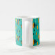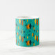 This mug has a mid-century modern atomic design of diamonds, and starbursts on a field of turquoise.