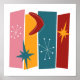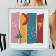 Make a statement in your walls with this bold atomic era mid century poster. With its pink, orange, blue, and red rectangles, stars, and boomerang it’s sure to get a few “wows”!