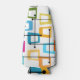 This bottle cooler has a design of rectangles that are stretched on one end in groovy colours, orange, green, teal, purple, blue, pink, and yellow with atomic lines crisscrossing them.