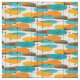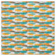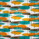 Starburst pattern mid-century modern inspired fabric in orange, teal and brown on a white background. The oval patterns were popular during the mid-century time period.
