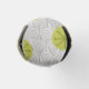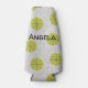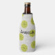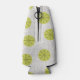 This bottle cooler has a mid-century modern design of tan arches repeating on white as a background with repeating green-gold circles with darker green-gold starbursts inside them.