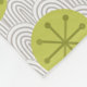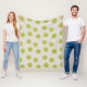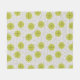 This medium fleece blanket has a mid-century modern design of tan arches repeating on white as a background with repeating green-gold circles with darker green-gold starbursts inside them.